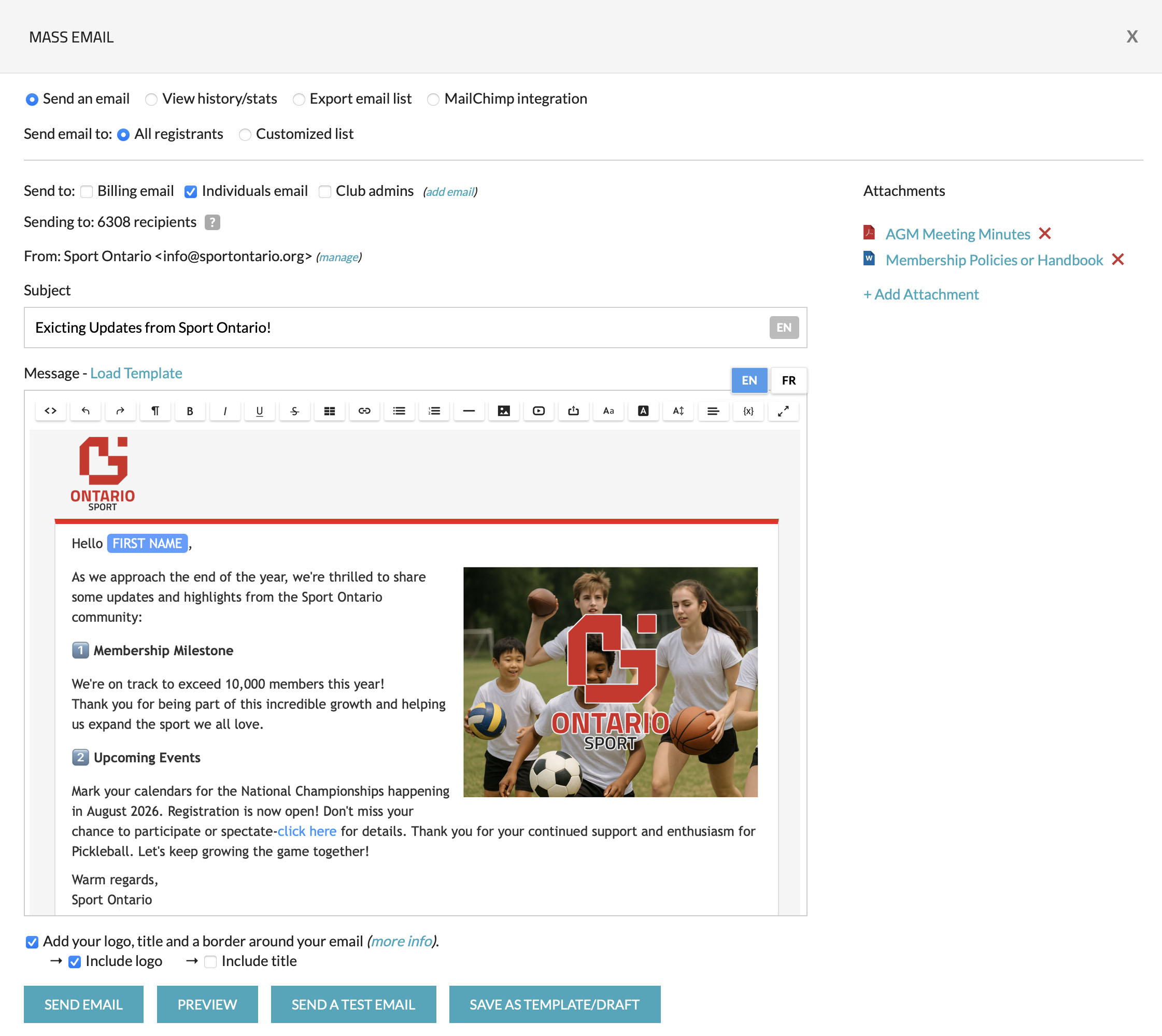 Need to share a PDF schedule, membership guide, or event poster? You can easily attach documents, images, or resources directly to your emails.
