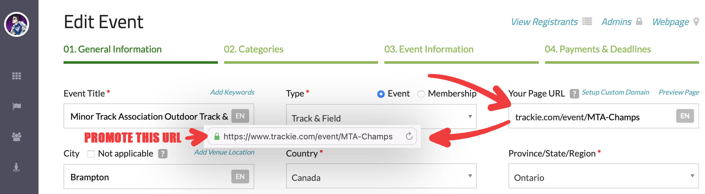 Why not make it as easy as possible for registrants to access your registration form. Rather than just stating "Register on Trackie.com", consider providing them a direct URL to your registration page. We offer the ability to set up a short custom URL that you can easily promote. By doing so, you allow registrants to access your registration form directly, eliminating the need for additional searches.