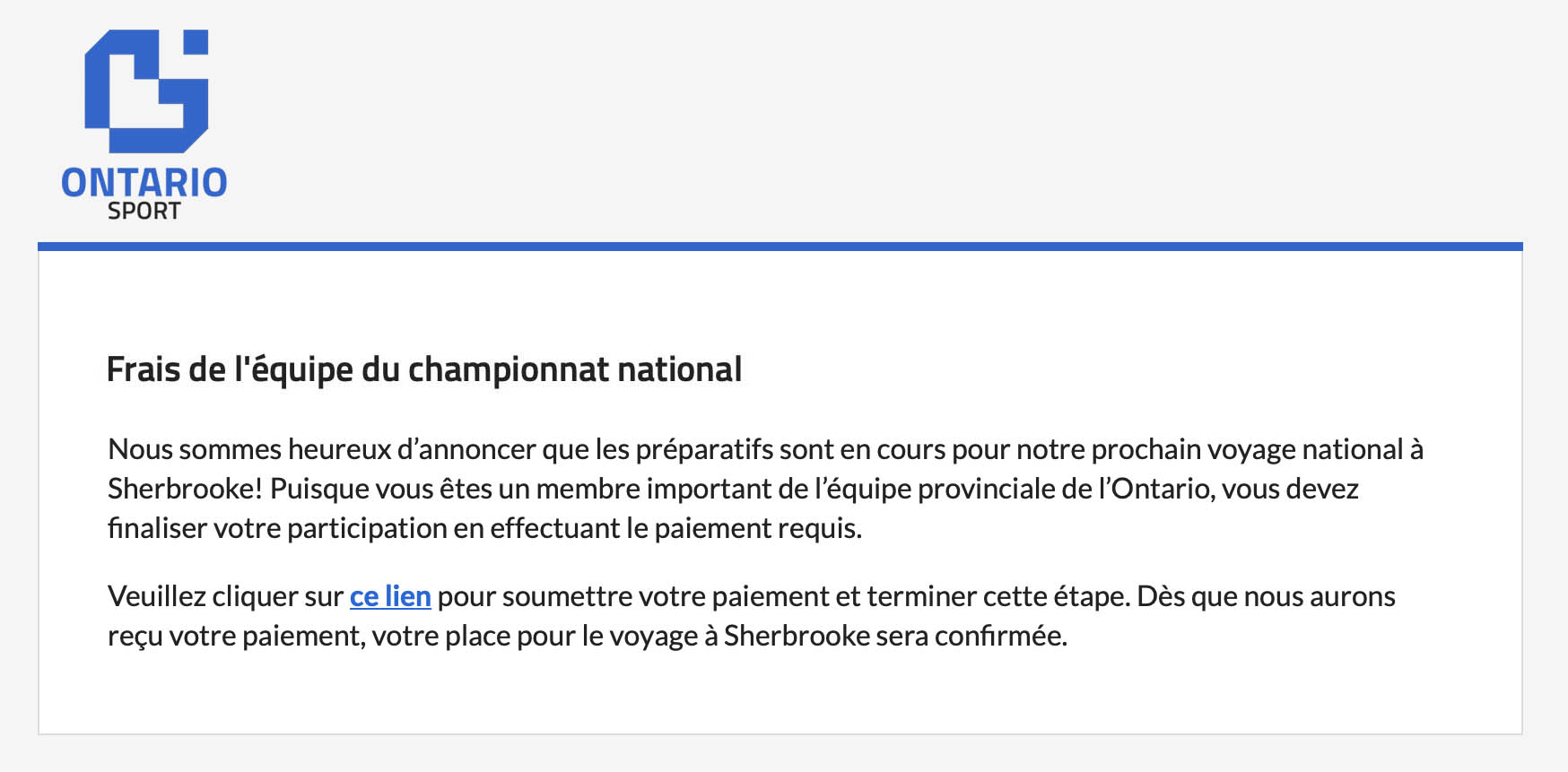 Si un paiement est requis au moment de cette transition, un courriel automatisé contenant un lien de paiement est envoyé. Dès que le paiement est effectué, la personne est officiellement ajoutée à la liste des participants inscrits.