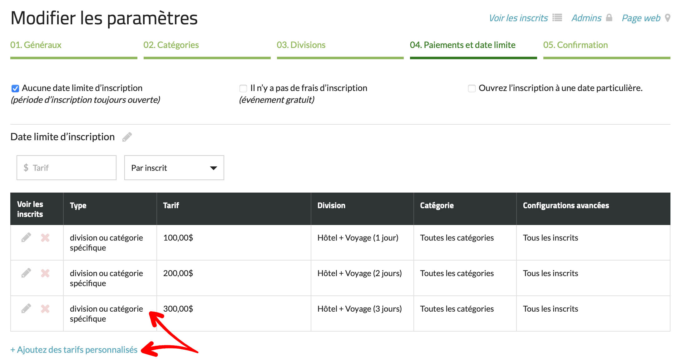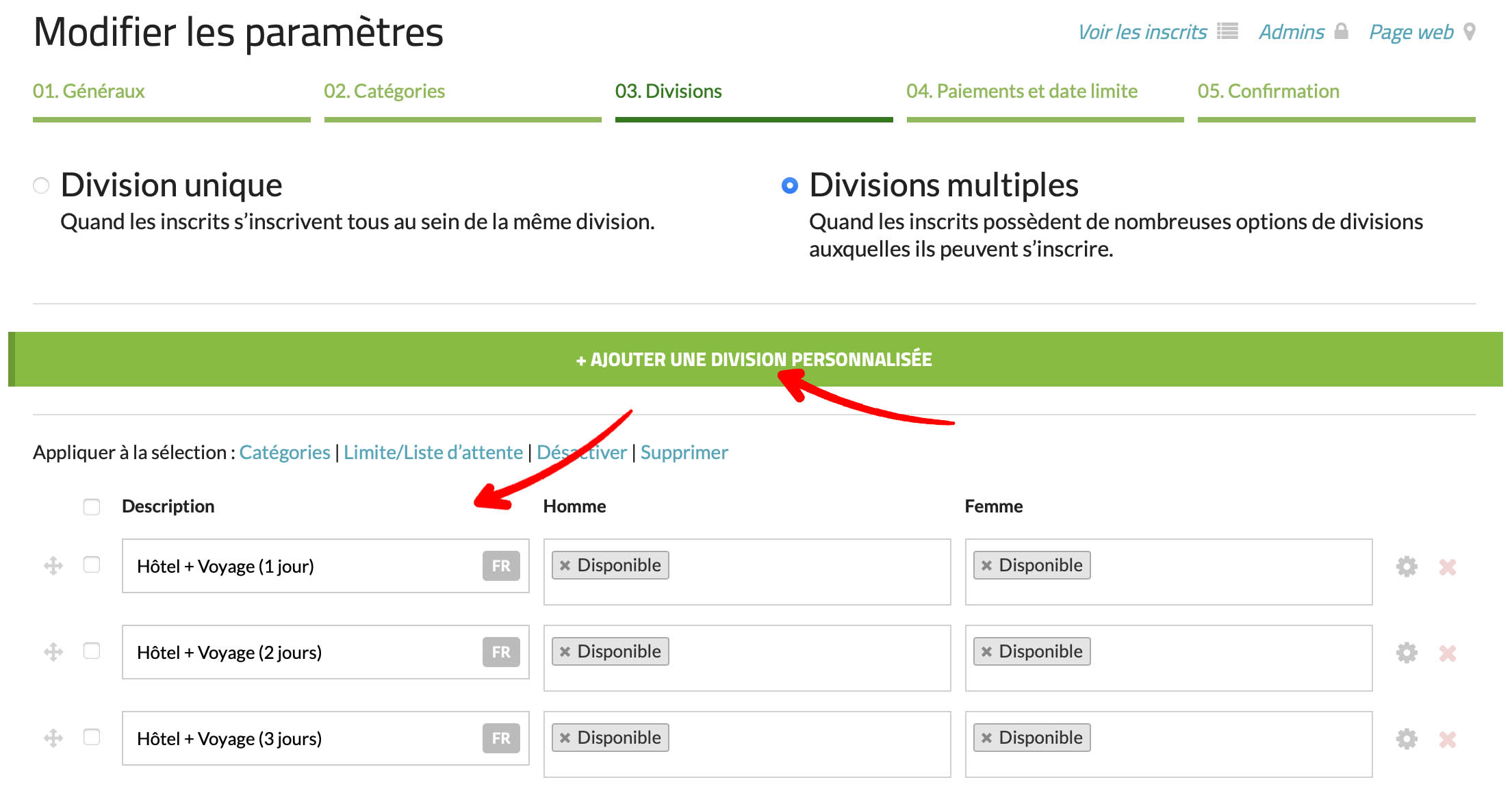 - Étape 2 : Dans la rubrique « 03 : Informations sur la division » (qui peut aussi s’intituler « Informations sur l’événement » en fonction du sport), créez une division distincte pour chaque paiement en attente.