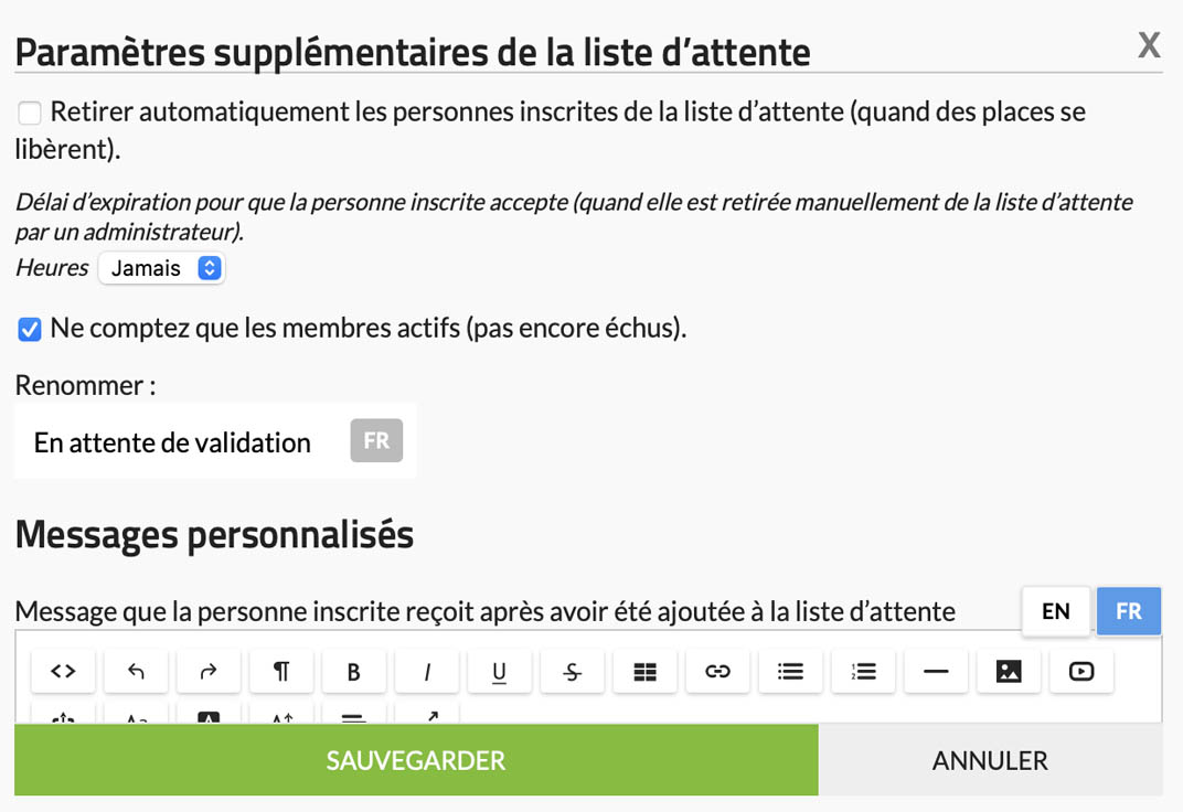 - Étape 3 : Cliquez sur le lien « Paramètres supplémentaires ». Assurez-vous que la case « Retirer automatiquement les personnes inscrites de la liste d’attente (quand des places se libèrent) » n’est pas cochée. Renommez l’étiquette « Liste d’attente » avec un nom plus approprié, par exemple « En attente de validation ». Au besoin, écrivez un message personnalisé. Cliquez ensuite sur « SAUVEGARDER ».
