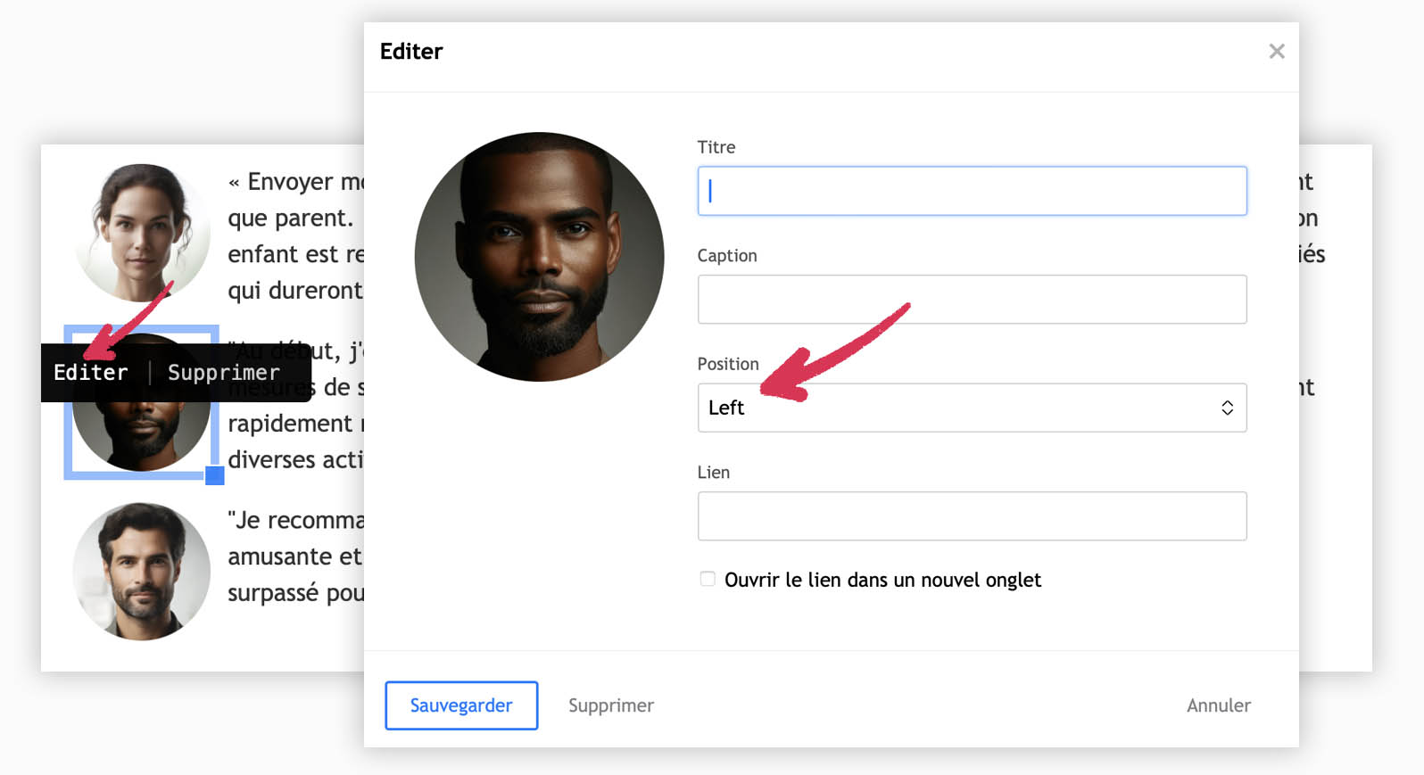 - Étape 5 : Si vous souhaitez que l'image soit placée à côté du texte, cliquez sur l'image et choisissez "Editer". Cliquez ensuite sur "Position" et choisissez l'option que vous souhaitez pour votre image.