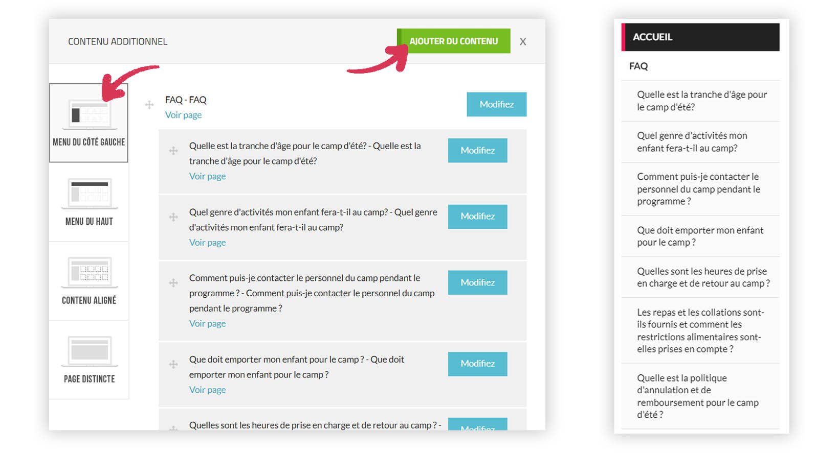 - Étape 1 : Créez une nouvelle section de contenu aligné dans votre page web en cliquant sur "Contenu additionnel" dans les "Options d'administration". Cliquez ensuite sur "Contenu Aligné", puis sur "Ajouter du Contenu".