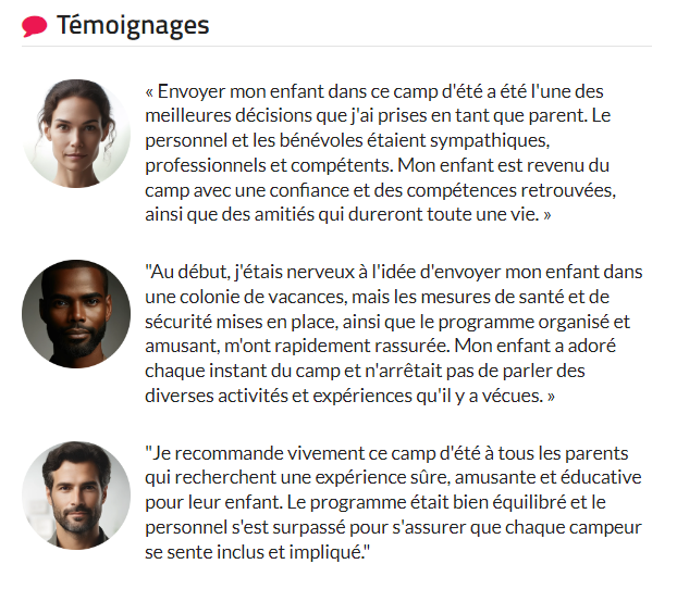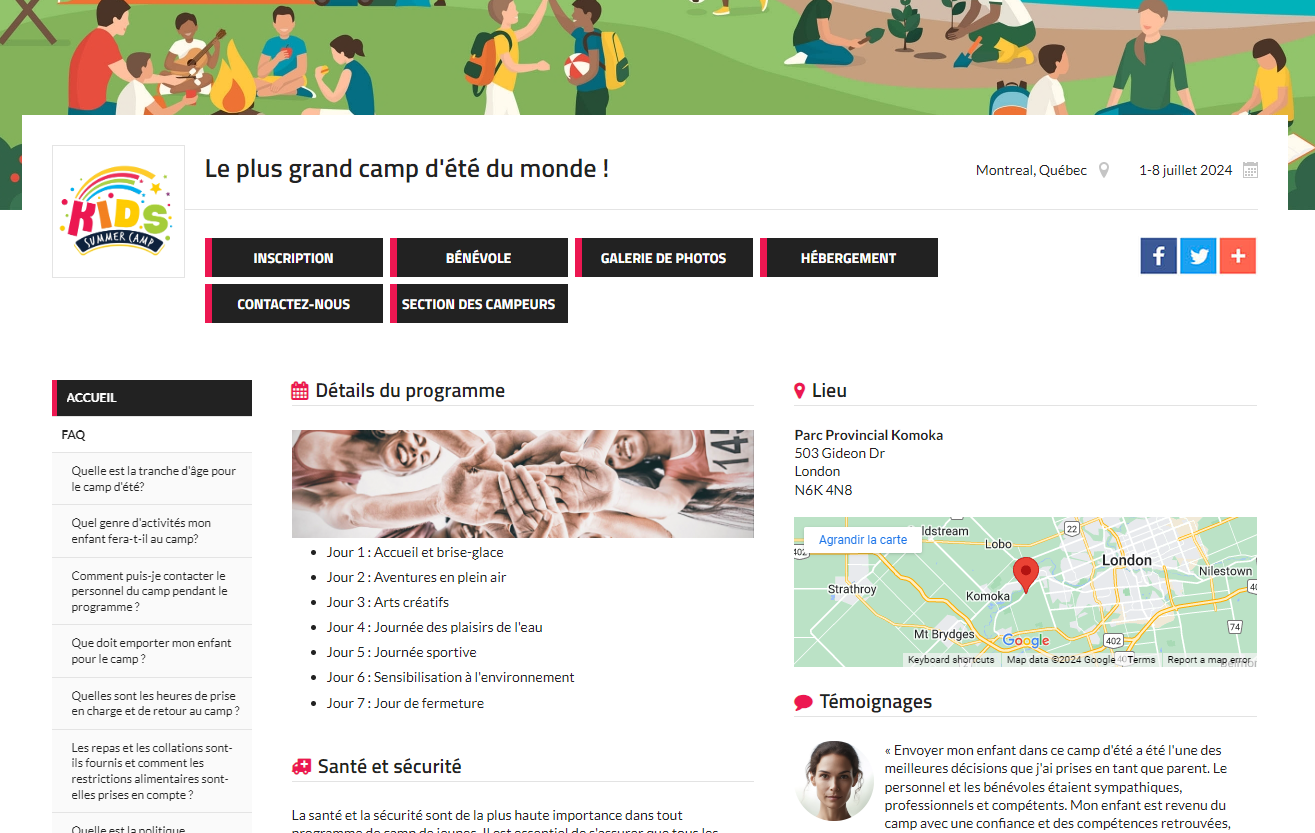 Notre fonction de contenu aligné vous permet d'ajouter de façon simple de nouvelles sections et d'incorporer des images dans votre page web. Dans notre exemple, nous avons développé du contenu aligné pour les sections "Détails du programme", "Santé et sécurité" et "Témoignages".