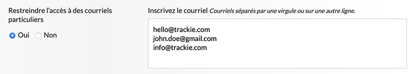 Pour une approche plus personnalisée, considérez limiter l’accès à des courriels particuliers. Cette méthode est particulièrement adaptée à des scénarios tels que la mise en place d’un championnat universitaire, où vous souhaiteriez que seuls les entraîneurs de l’université aient accès au formulaire d’inscription. Elle garantit que seules les personnes dont les courriels ont été approuvés au préalable peuvent procéder à des inscriptions. Bien que cette approche soit un peu moins pratique que l’utilisation d’un simple code d’accès, elle offre une sécurité accrue dans le contrôle de l’accès aux inscriptions.