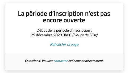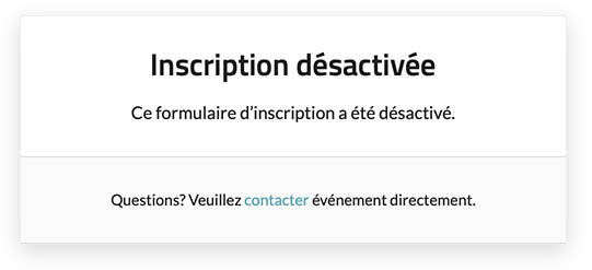 Dans certains cas, il peut s’avérer nécessaire de suspendre ou d’arrêter complètement les inscriptions. Cela peut s’avérer nécessaire si votre événement atteint sa capacité maximale, en particulier si vous n’utilisez pas la fonction de limites d’inscription et liste d’attente. D’autres raisons peuvent être la nécessité d’apporter des modifications substantielles aux détails de l’événement ou de résoudre divers problèmes logistiques. En désactivant les inscriptions, que ce soit de manière temporaire ou permanente, vous contrôlez totalement cet aspect important de la gestion de votre événement.
