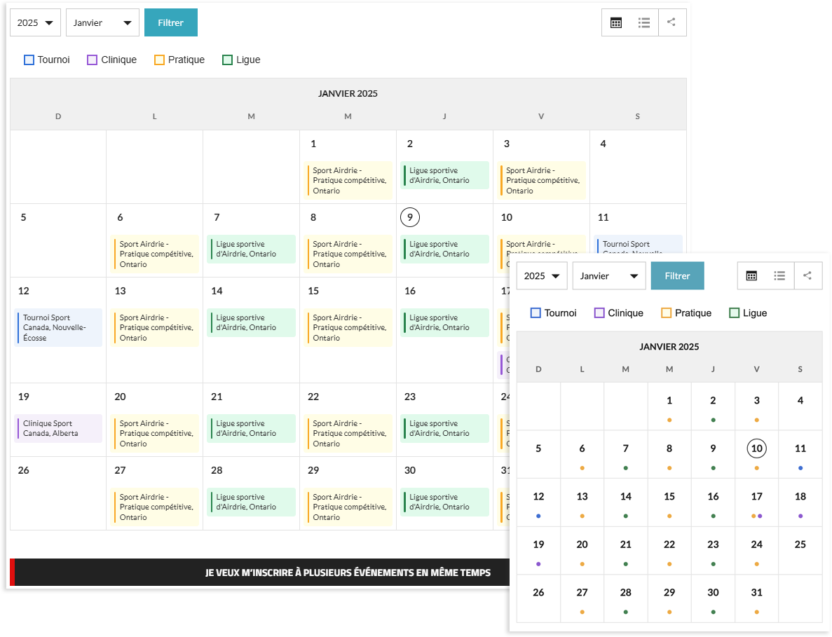 Le widget de calendrier offre une interface intuitive pour naviguer et filtrer les événements :