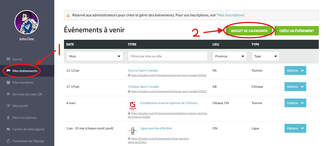 - Événements gérés par d'autres administrateurs de votre club : Affiche les événements appartenant à d'autres administrateurs dans la liste des administrateurs de votre club.