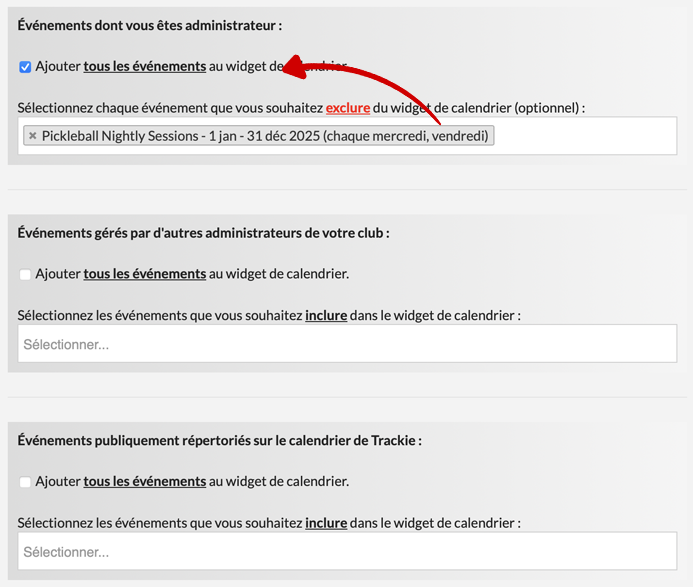 Vous pouvez choisir d'ajouter tous les événements au widget de calendrier, puis d'en exclure certains en les sélectionnant. Vous pouvez également commencer avec un calendrier vide en ne cochant pas la case « Ajouter tous les événements au widget du calendrier » et en sélectionnant uniquement les événements que vous souhaitez inclure.