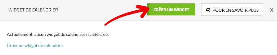 Dans cette fenêtre, vous pouvez créer et modifier vos widgets de calendrier externes. Pour créer un nouveau widget de calendrier, il suffit de cliquer sur le bouton vert « CRÉER UN WIDGET ».