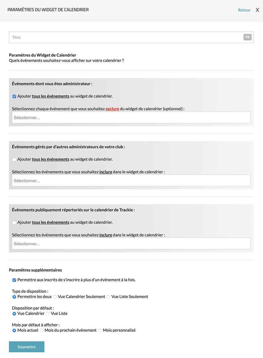 Cette fonction vous permet de créer un widget de calendrier personnalisable qui affiche vos événements. Parfait pour les clubs et les organisations, le widget peut être incorporé sur des sites web externes ou intégré dans les pages web construites avec notre système, ce qui permet de tenir votre public informé des événements à venir, de lui fournir des détails supplémentaires et de lui permettre de s'inscrire facilement à un ou plusieurs événements en même temps.