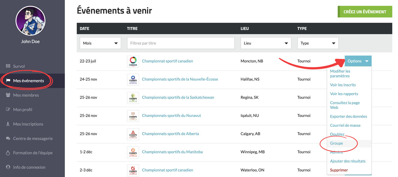 - Allez dans la section « Mes événements » ou « Mes membres du site.