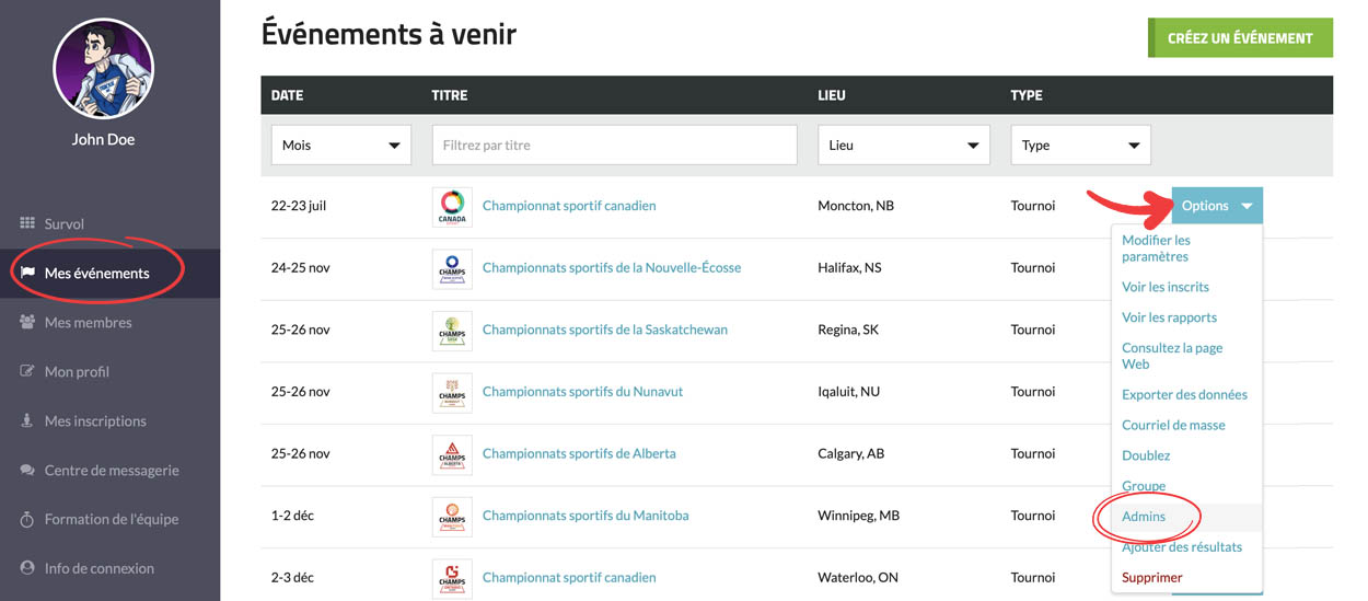 Allez dans la section « Mes événements » ou « Mes membres ». Cliquez ensuite sur le bouton « Options », puis sélectionnez l’option « Admins ».