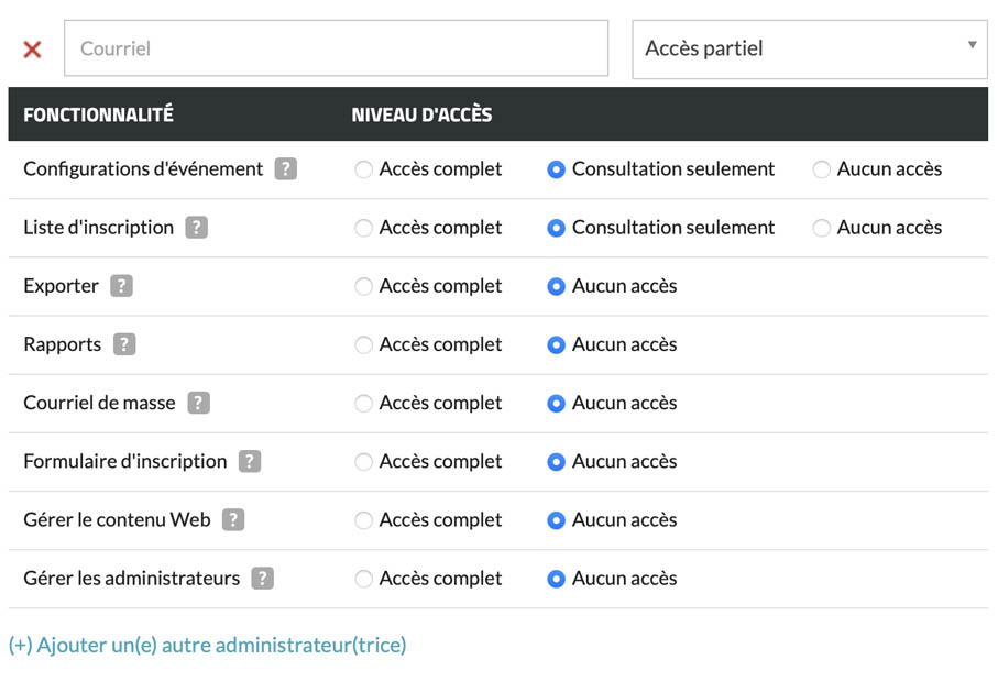 Le système vous offre la possibilité d’accorder un accès administratif total ou partiel à d’autres adresses électroniques. Cela vous permet de gérer facilement plusieurs utilisateurs qui peuvent accéder à vos événements et à vos pages d’adhésion en fonction de vos besoins spécifiques.
