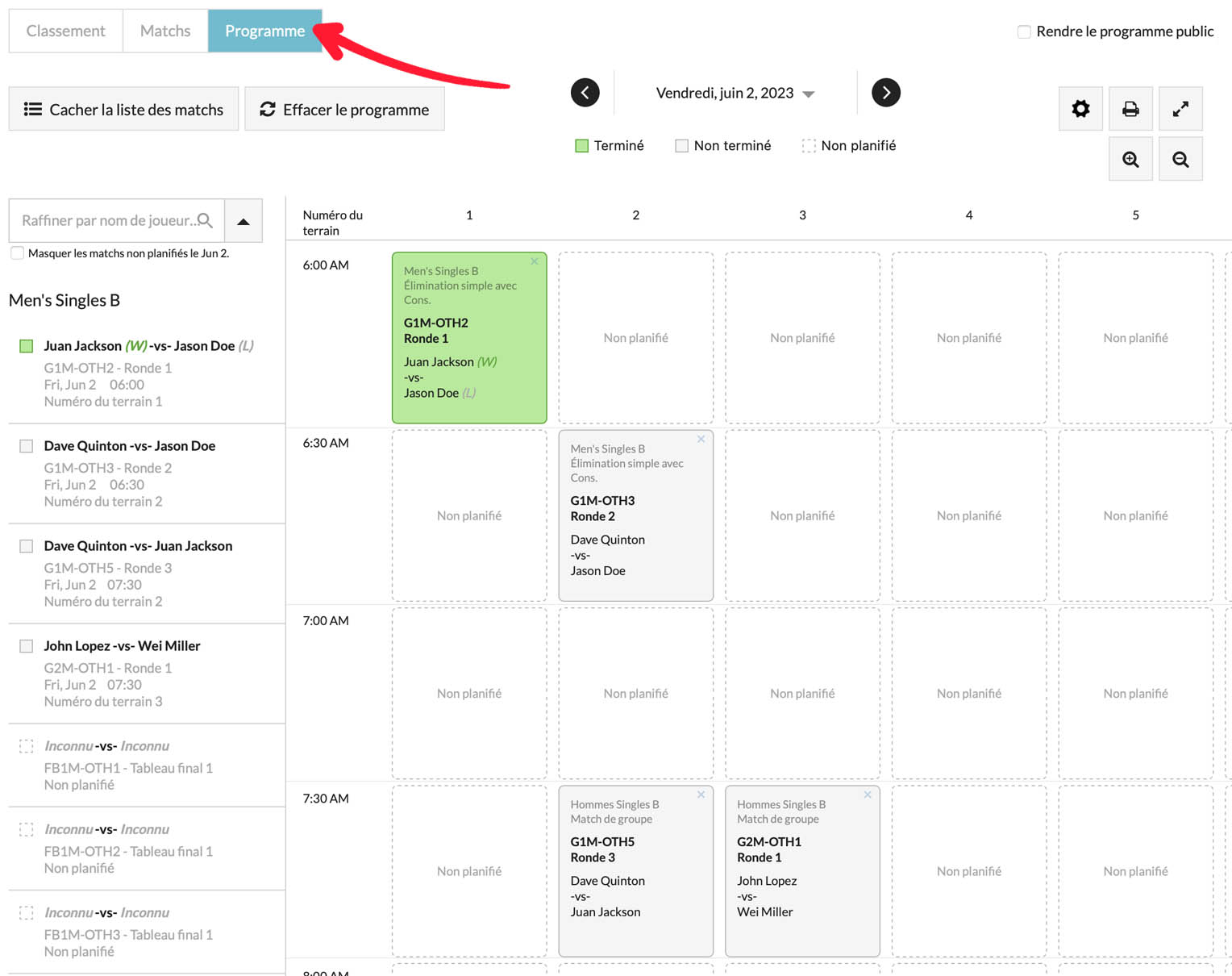 - Non programmé : Un terrain/une plage horaire est disponible pour la programmation d’un match.