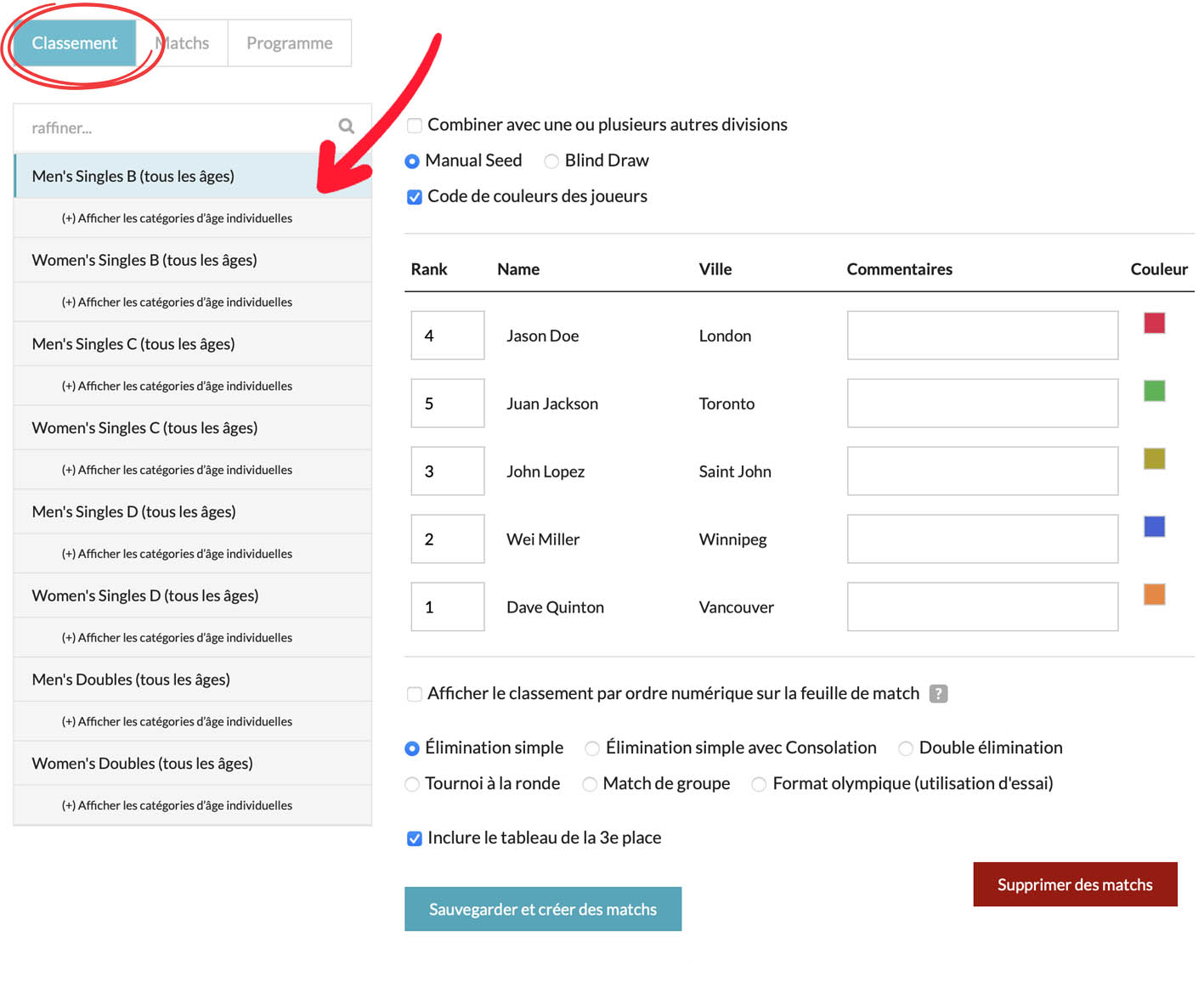 Pour créer des matchs, il suffit de cliquer sur l’option « Classement ». Vous verrez alors apparaître la liste des divisions que vous avez créées, ainsi que les participants actuels dans chaque division, comme illustré ci-dessous.