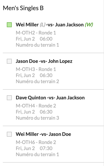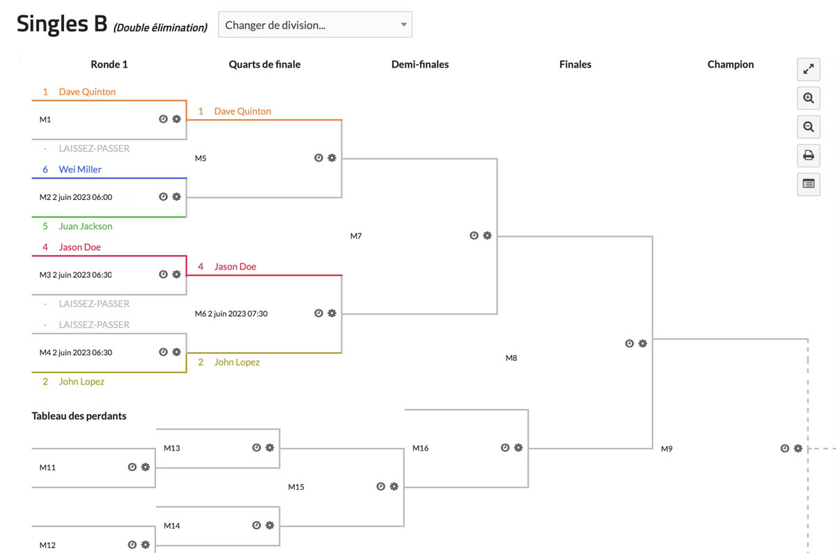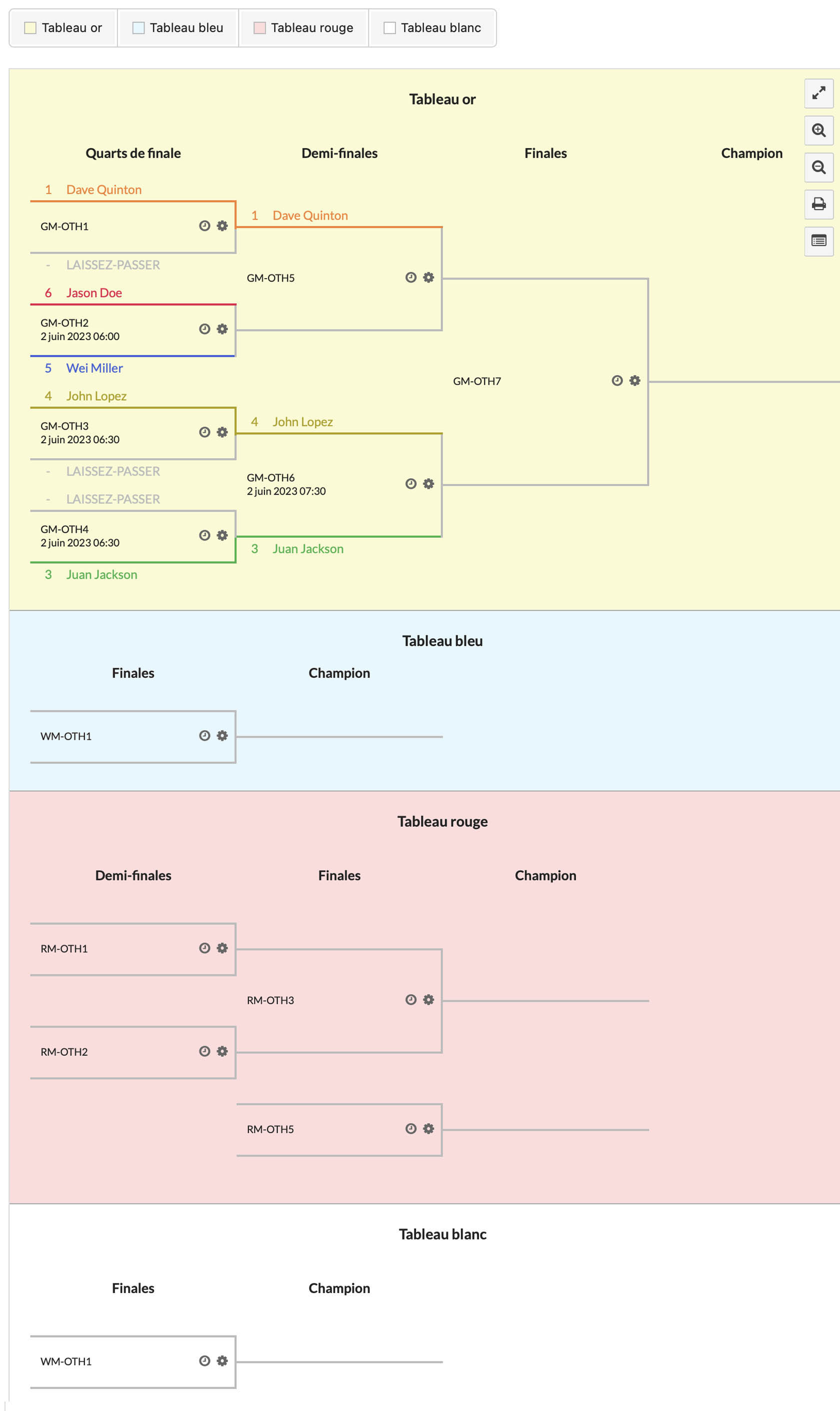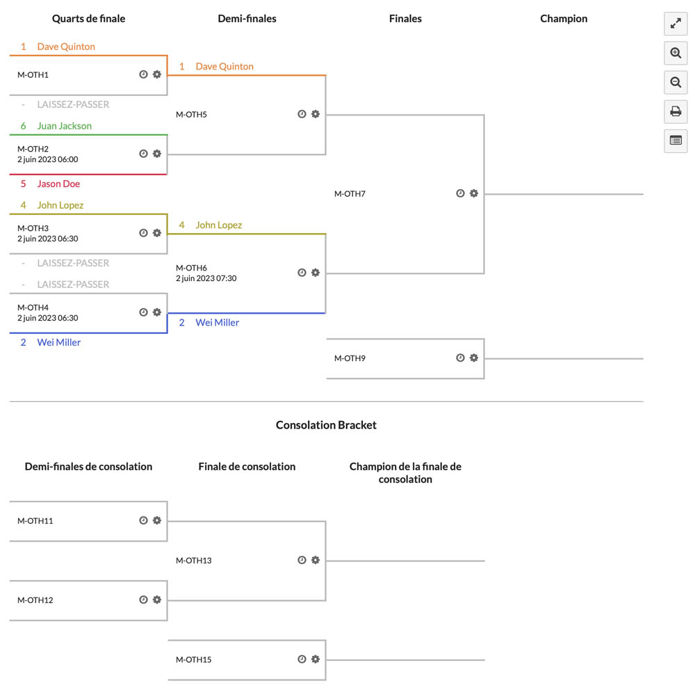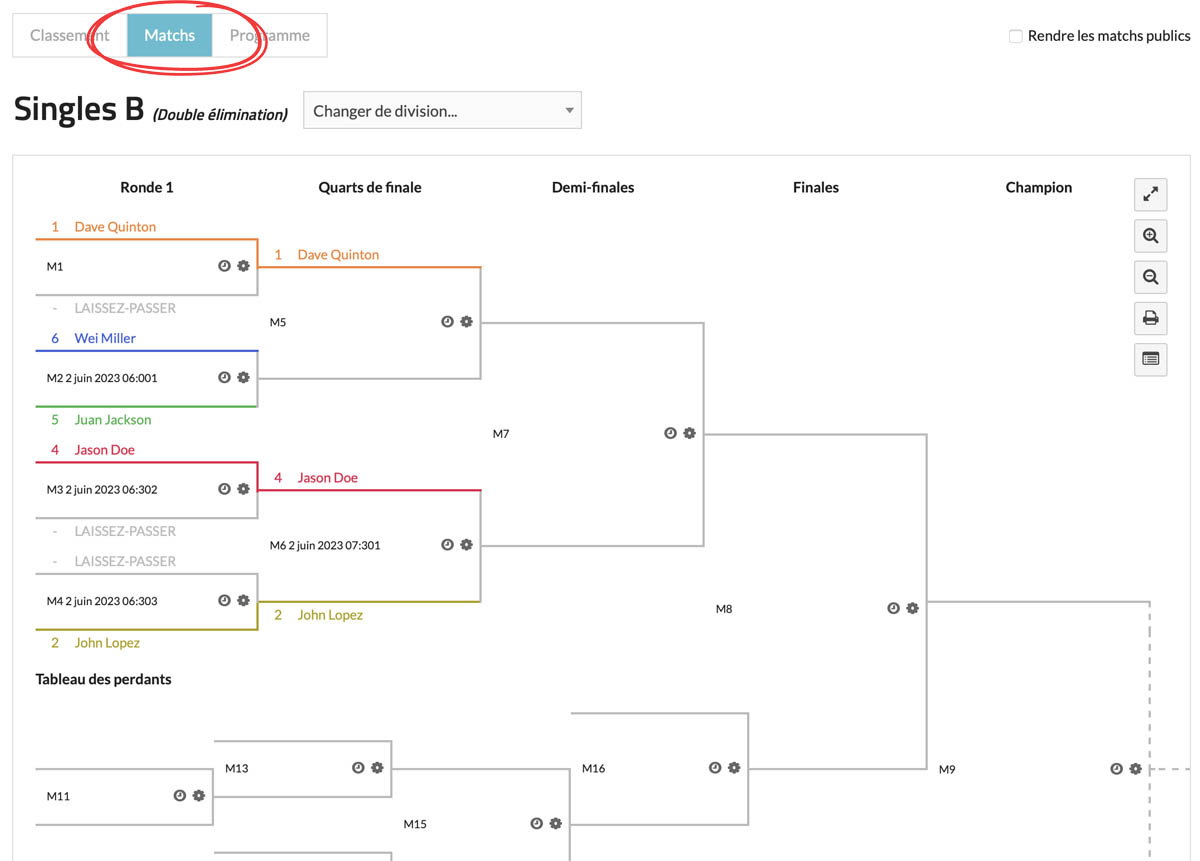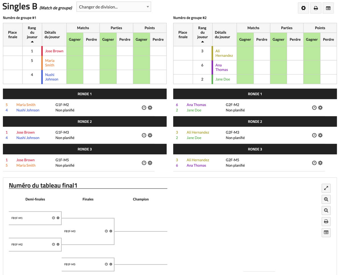 Vous avez aussi la possibilité de coder par couleur les participants aux matchs, ce qui peut faciliter l’organisation visuelle, en particulier quand il s’agit d’un grand nombre de participants. |