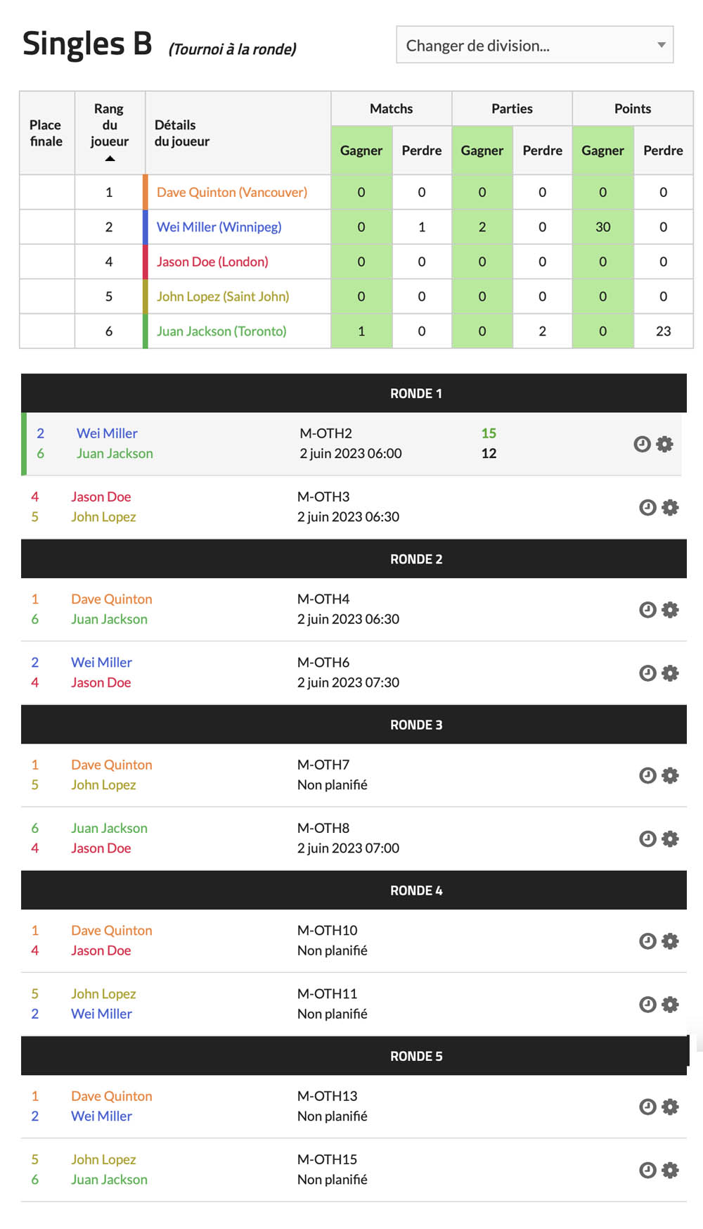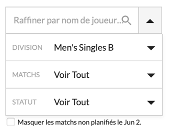Permet la recherche par nom de participant(e), le tri par division et statut du match.