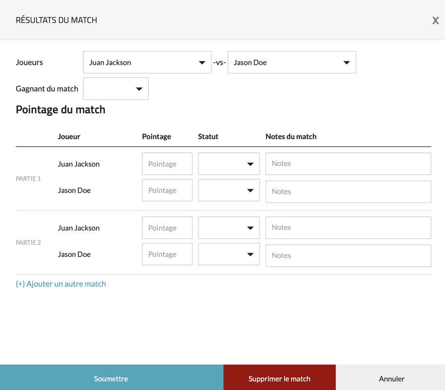 Permet de saisir les résultats d’un match, y compris le/la vainqueur(e)/perdant(e), les pointages et toutes les notes qui les accompagnent. L’interface permettant d’ajouter des résultats est illustrée ci-dessous :