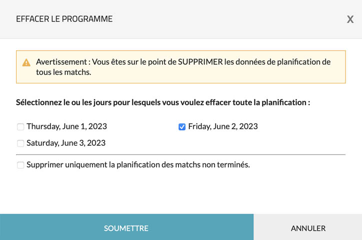 Pour plus d’informations sur la création et la programmation des matchs, veuillez vous référer aux sections ci-dessous.