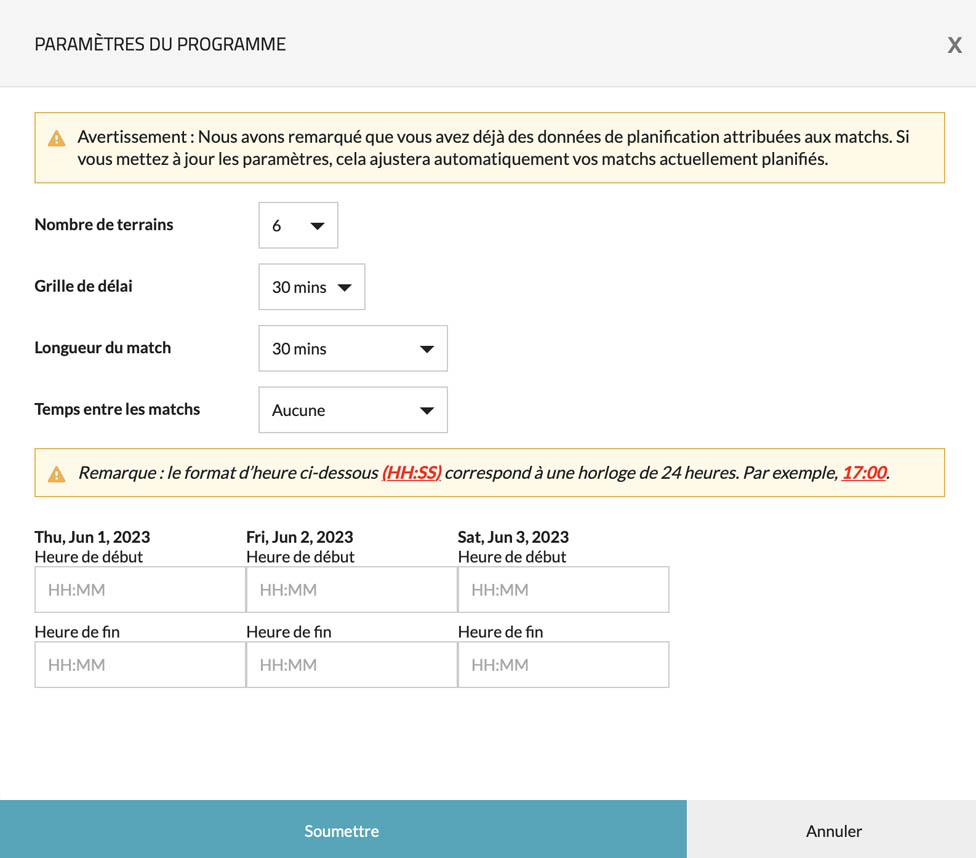L’interface vous permet de spécifier les terrains, la période, la durée des matchs, l’écart entre les matchs et l’heure de début et de fin de chaque journée. Quand l’on clique dessus, l’interface se présente comme suit :