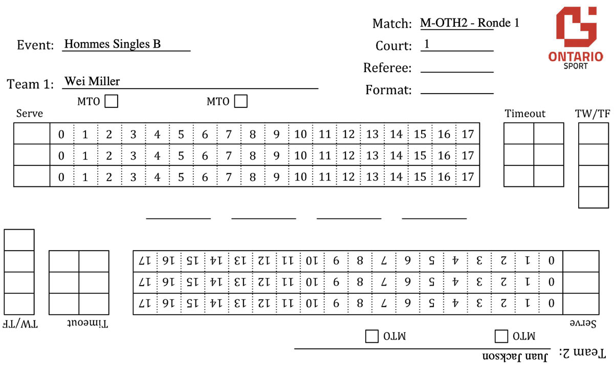 Une carte de score est une feuille imprimée utilisée pour suivre les scores et la progression d’un match, comprenant les noms des joueurs, les numéros de jeu ou de set, les colonnes de pointage et un indicateur de serveur.