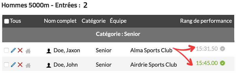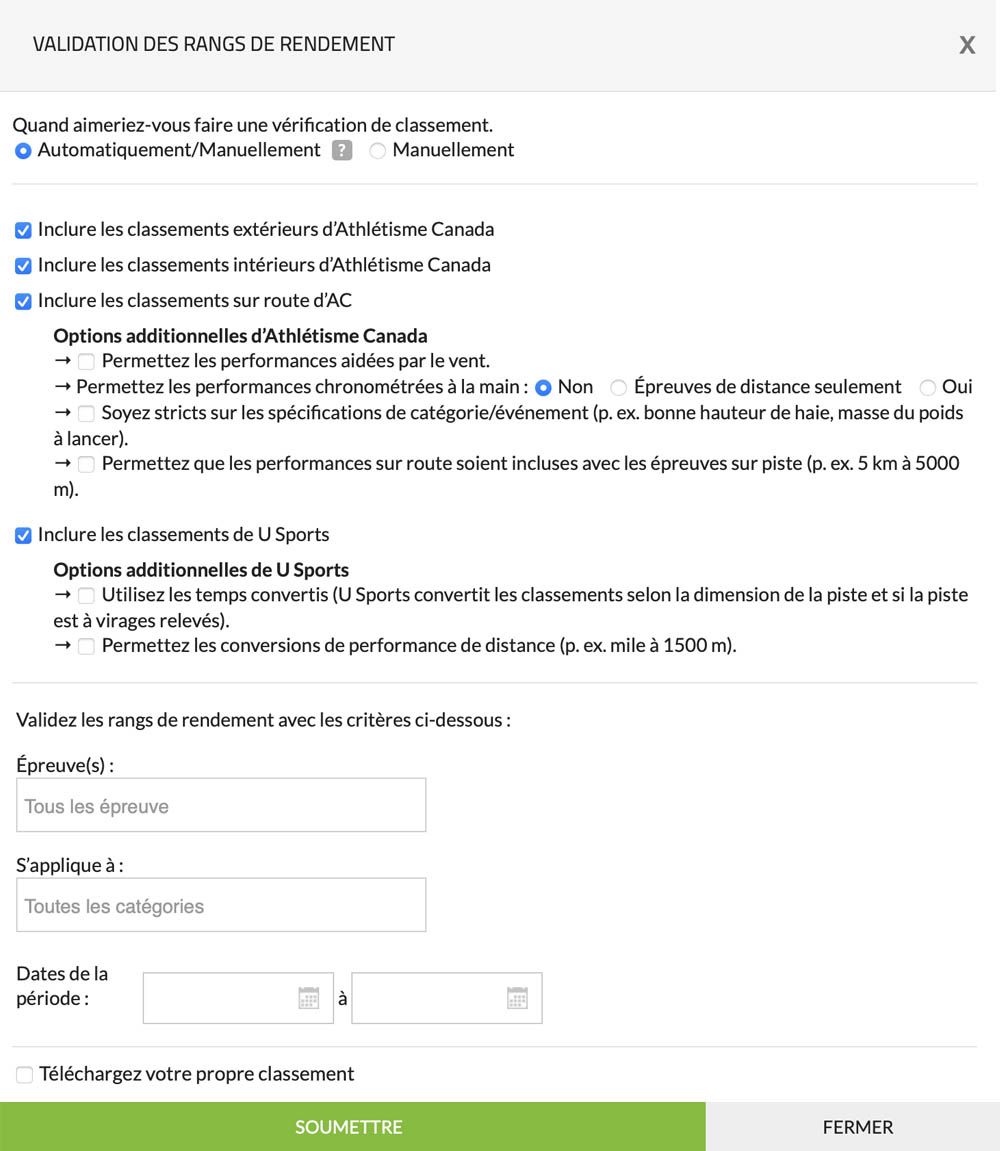 Si vous souhaitez utiliser la fonctionnalité de validation des performances de classement pour des classements autres qu’Athlétisme Canada et U Sports, veuillez nous contacter pour vous renseigner sur l’intégration de nouveaux classements. |