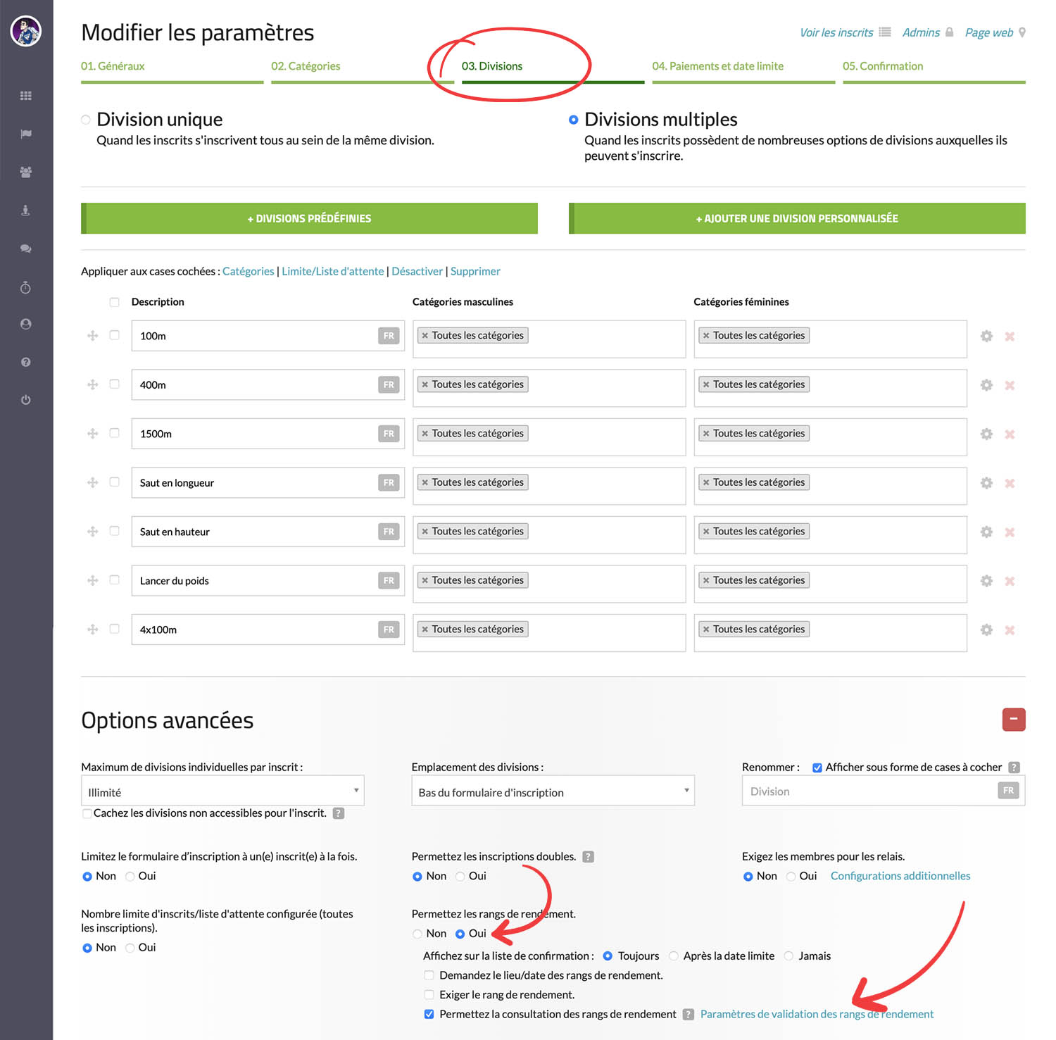 Vous avez la possibilité d’activer la validation des performances de classement. Pour accéder à ce paramètre, vous devez d’abord créer un formulaire d’inscription. Vous trouverez ces paramètres sous « Étape 3 : Divisions » et « Options avancées ».