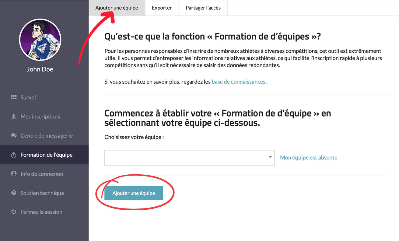 Avant d’utiliser la section « Liste d’équipe », vous devez ajouter au moins une équipe. Pour commencer, sélectionnez votre équipe et cliquez sur le bouton « Ajouter une équipe ».