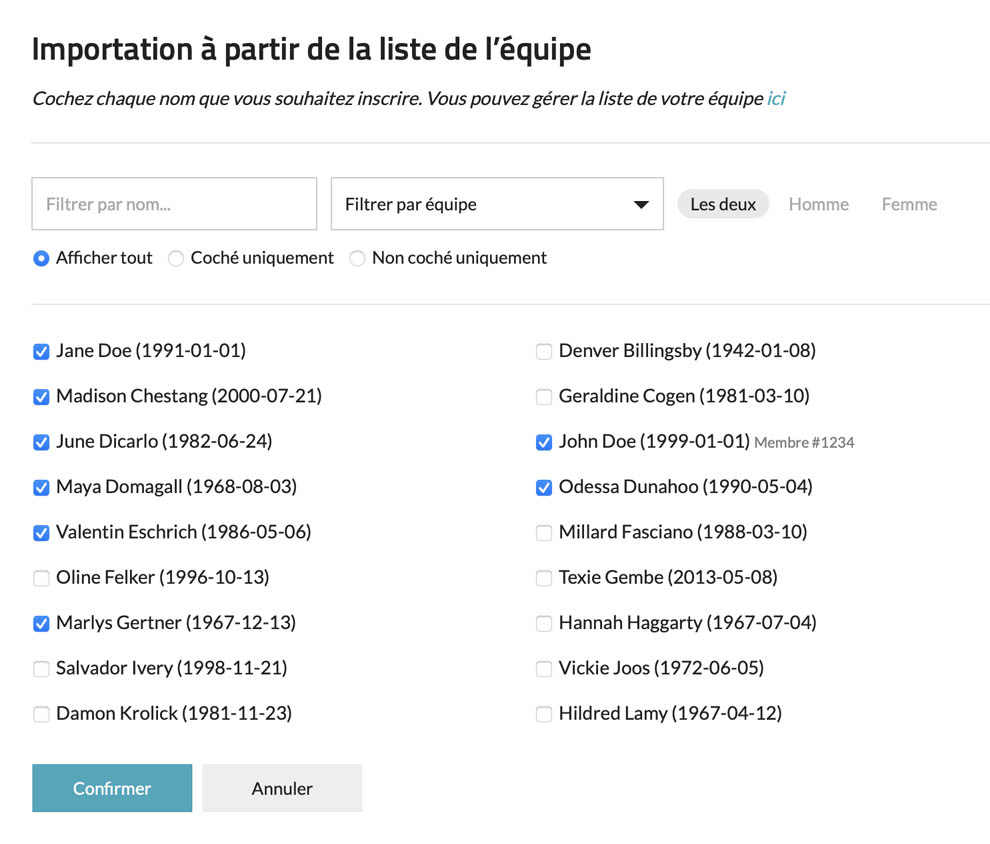 Sélectionnez chaque athlète de votre équipe que vous souhaitez inscrire à l’événement, puis cliquez sur le bouton « Confirmer ».