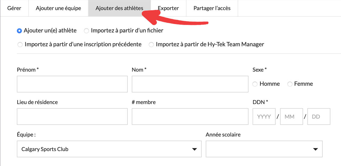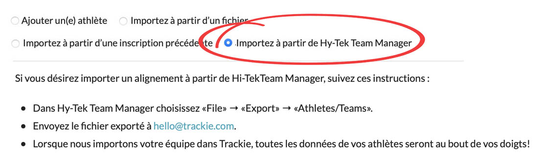 Importer à partir de Hy-Tek Team Manager : Si vous utilisez Hy-Tek Team Manager, envoyez-nous par courriel votre fichier « Athlètes/Équipes » et nous pourrons importer vos athlètes pour vous.