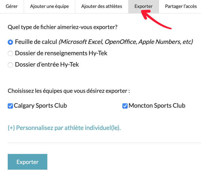 Si vous avez plusieurs équipes, vous pouvez aussi sélectionner l’équipe ou les équipes que vous souhaitez exporter, ou même effectuer des recherches sur les athlètes individuels que vous souhaitez exporter.