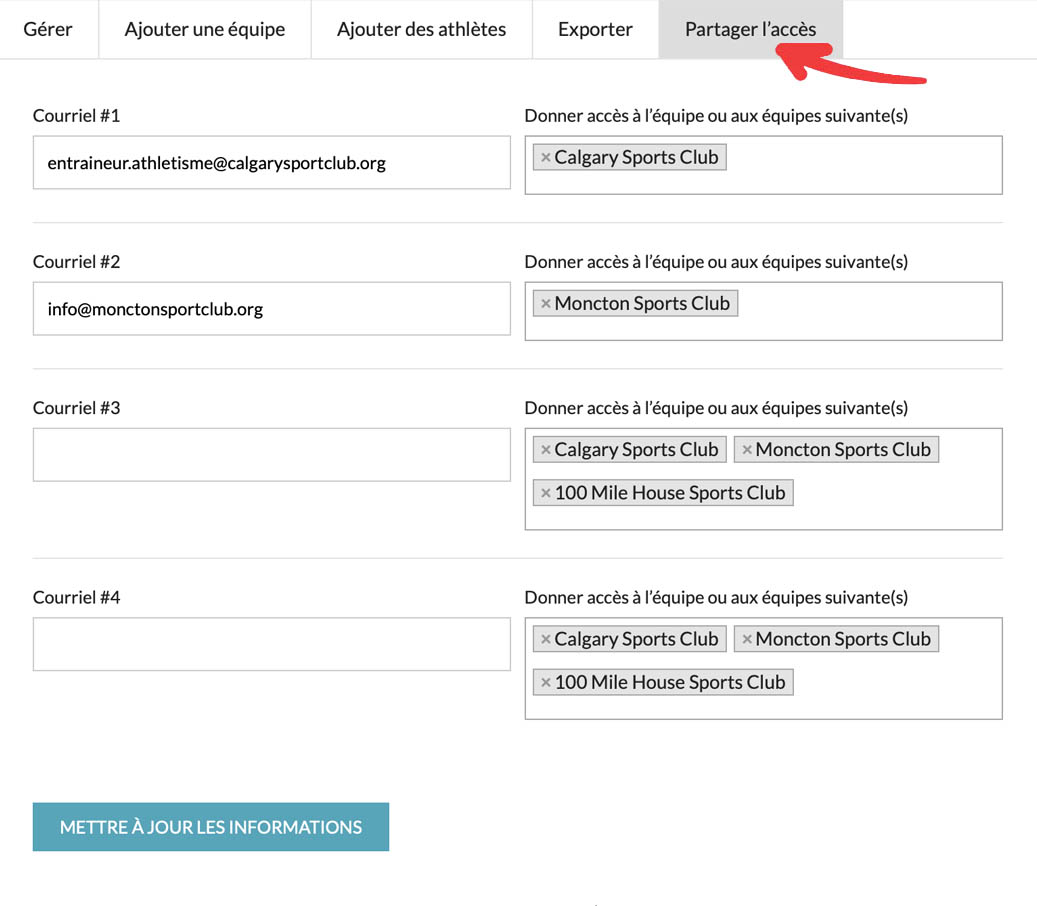 Nous offrons la possibilité de partager votre liste d’équipes avec d’autres courriels, ce qui vous permet de personnaliser l’accès de chaque courriel à des équipes spécifiques. Ceci est particulièrement utile dans les situations où une école a plusieurs entraîneurs qui ont besoin d’accéder à la même liste d’équipes.