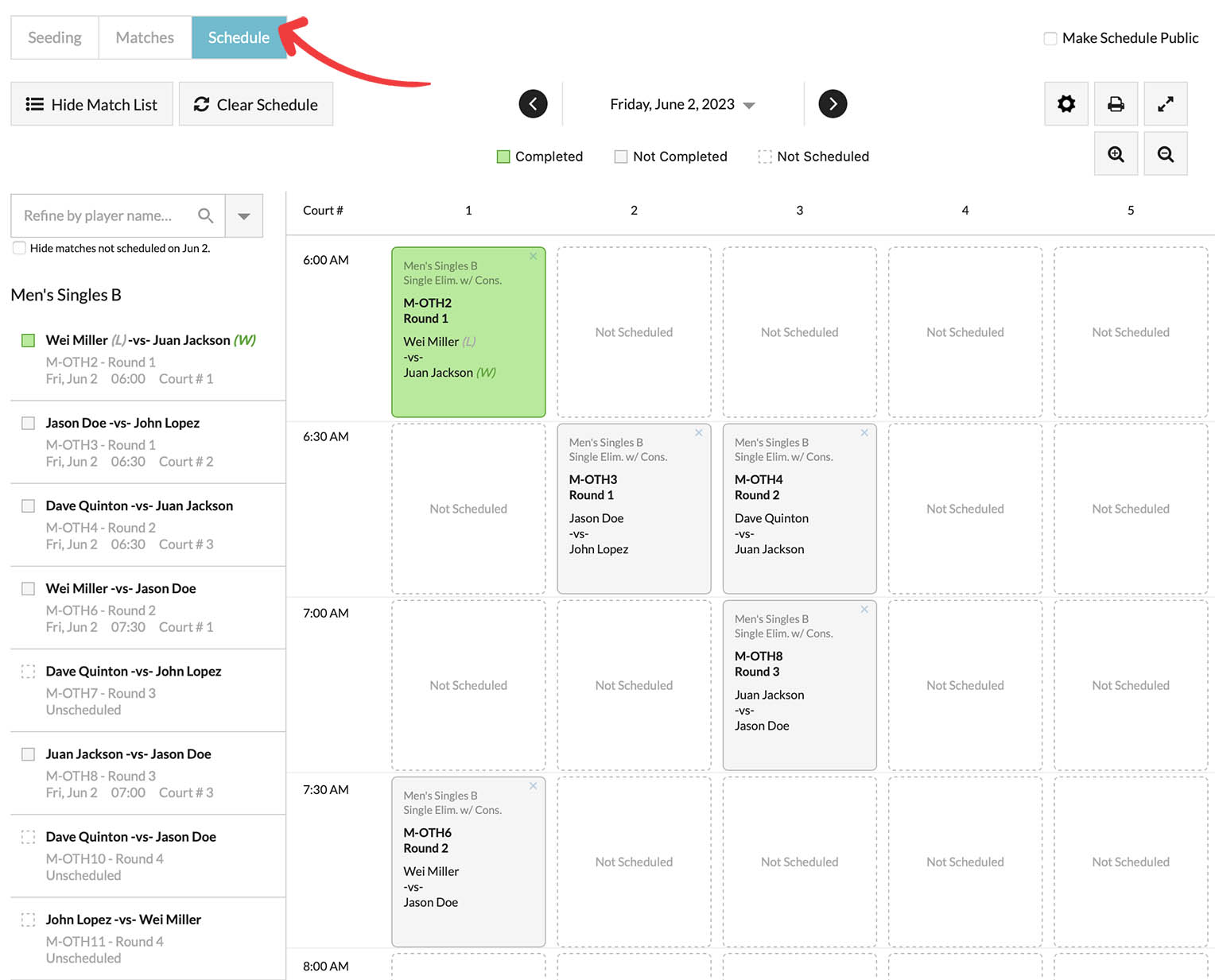 To access scheduling of matches, simply click on the "Schedule" option. It will display an interface similar to below: