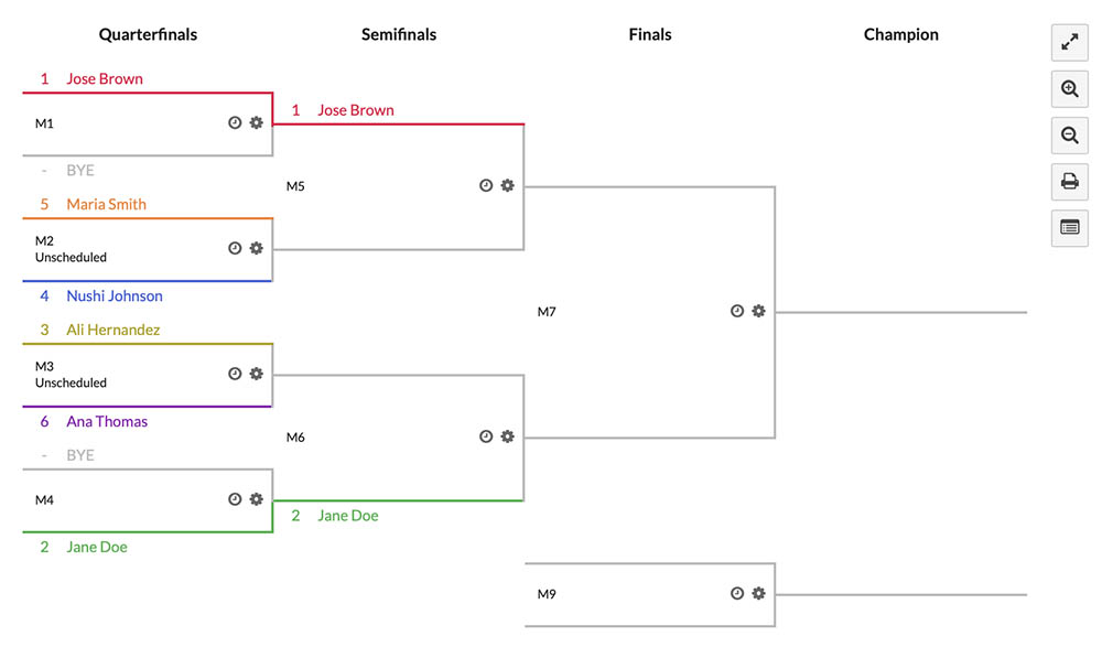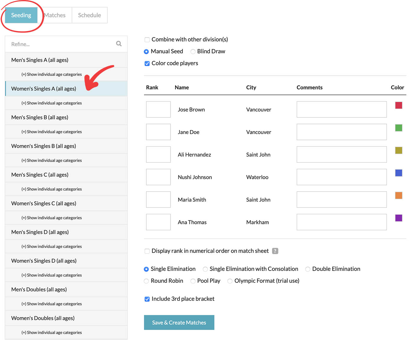 You also have the option to color code participants in the matches, which can aid in visual organization, especially when dealing with a large number of participants.