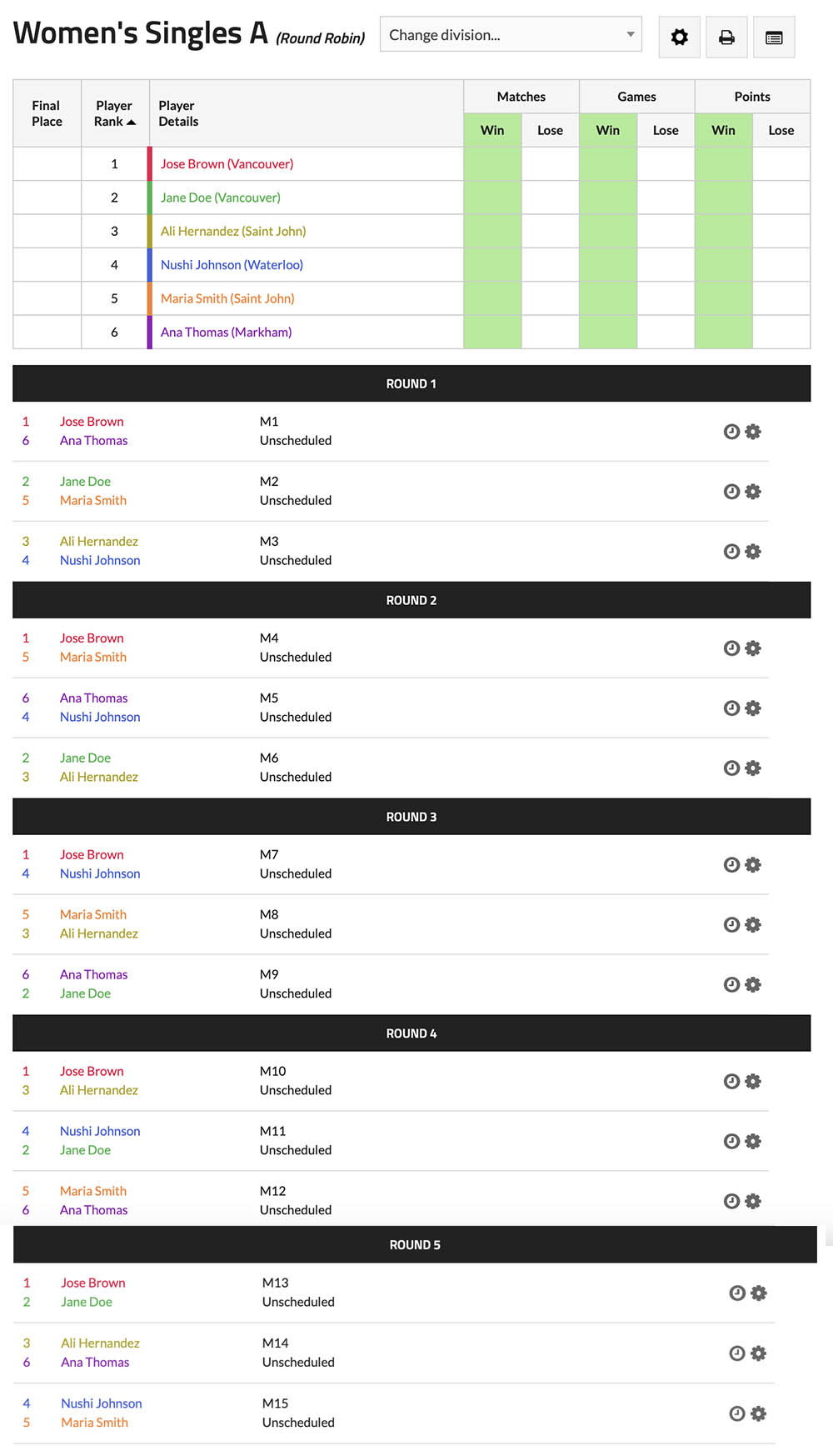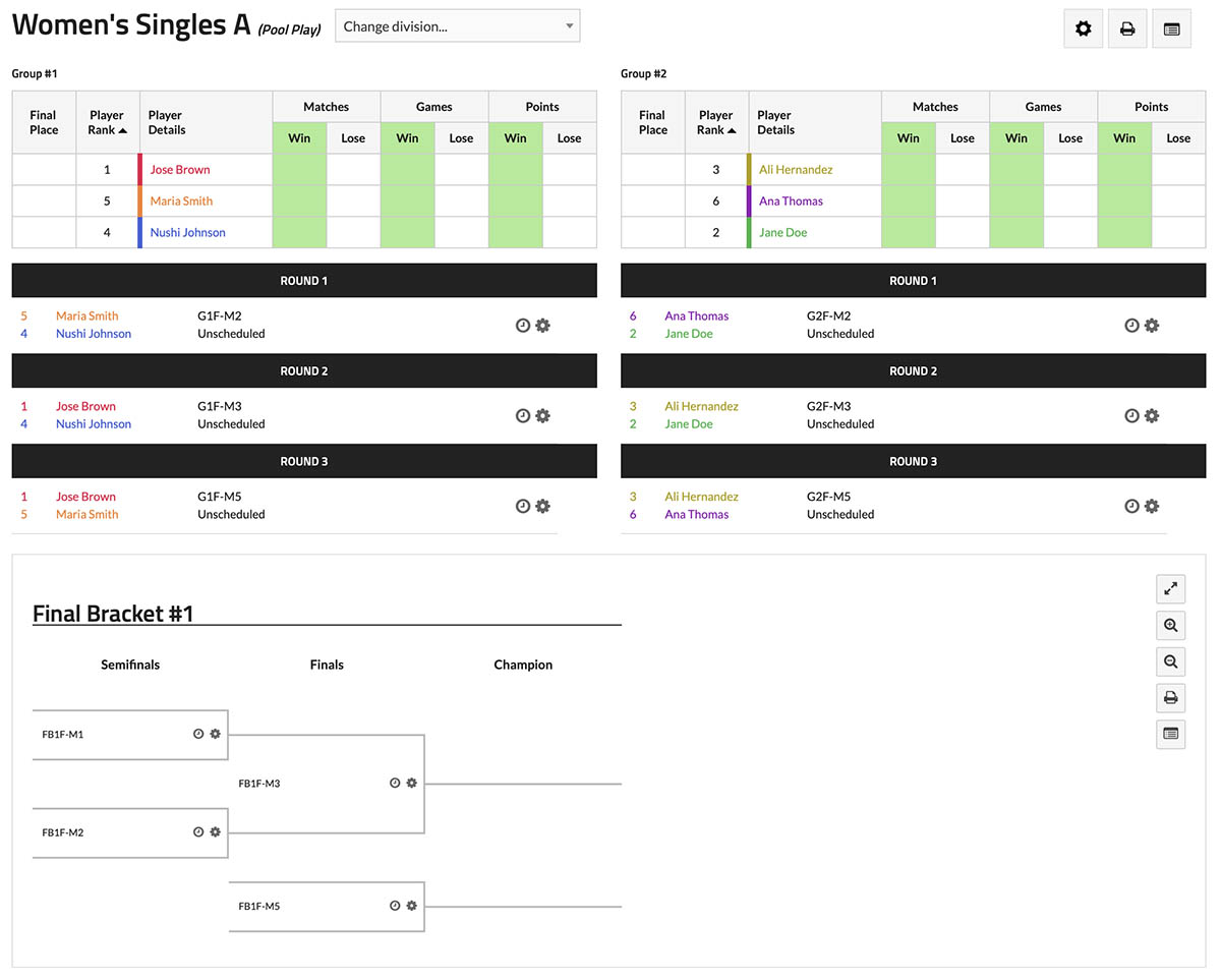 Allows searching by participant name, sorting by division, and status of match.