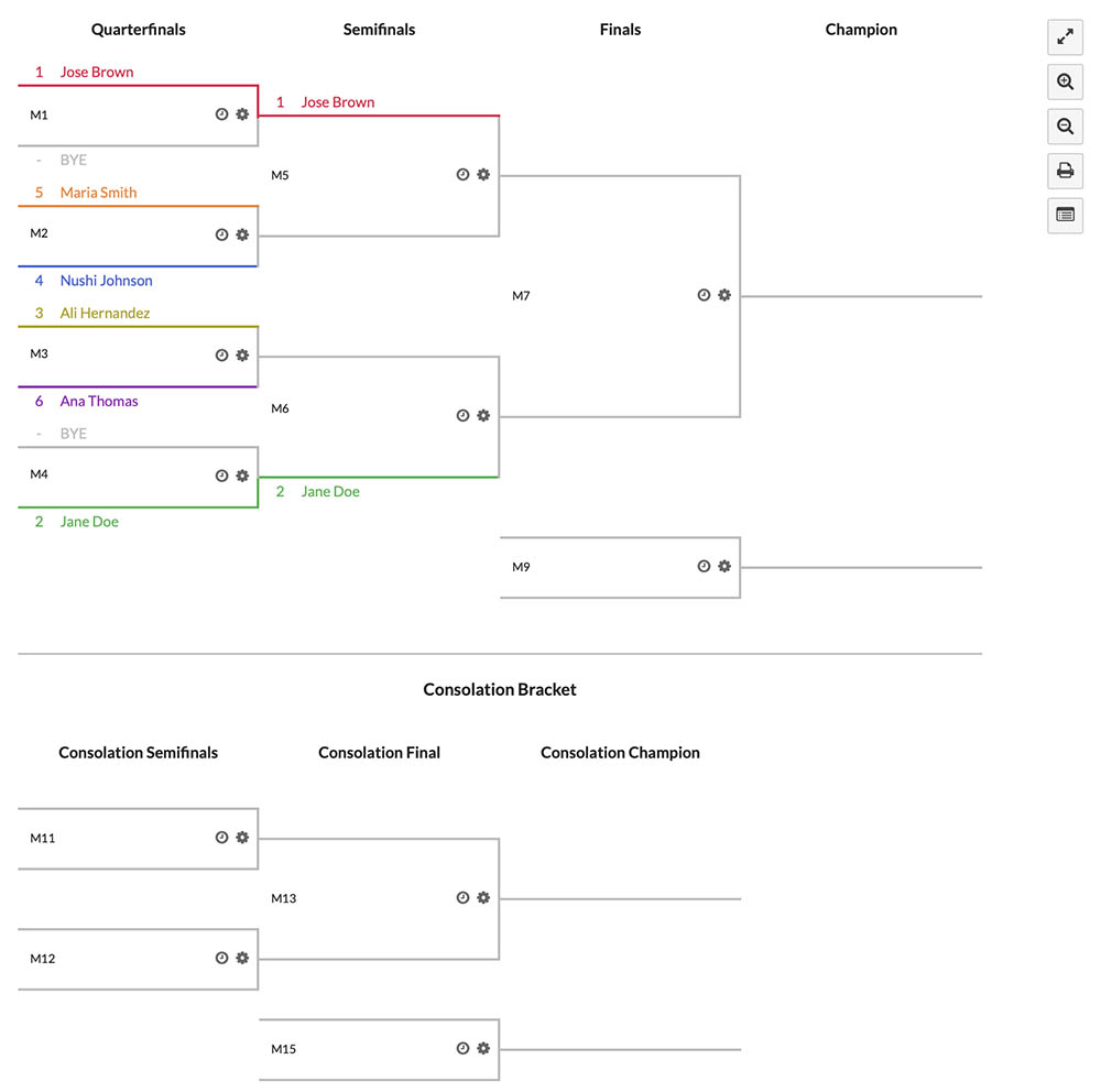 • Single Elimination with Consolation: Participant who loses a match are dropped down to the consolation bracket, ensuring that each participant plays in a minimum of two matches. (+) Show example