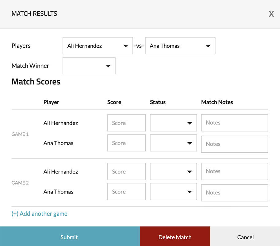 Enables you to enter match results, including the winner/loser, scores, and any accompanying notes. The interface for adding results is shown below: