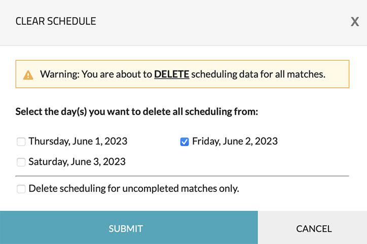 Allows you to quickly schedule a specific match. For more information on scheduling matches click here.