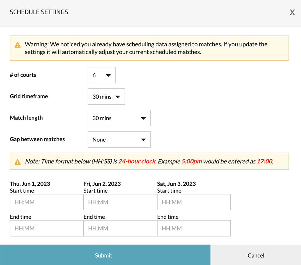The interface lets you specify courts, timeframe, match length, gap between matches, and start/end time of each day. When clicked, it looks as shown below: